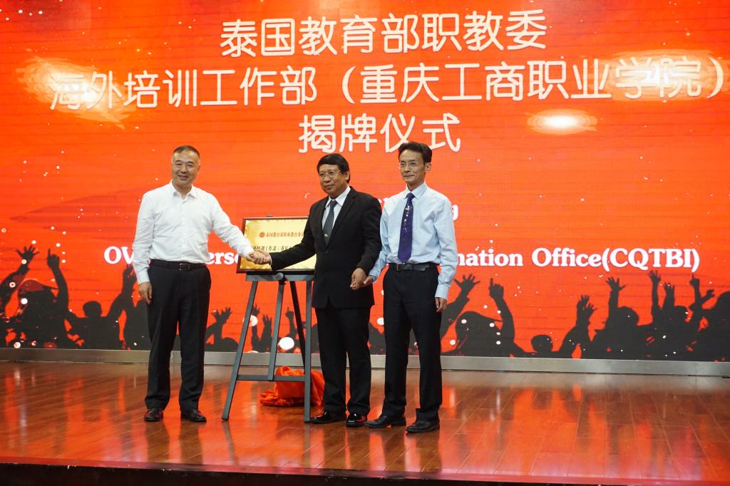 6月17日上午,泰国教育部职教委重庆工商职业学院海外工作培训部(OVEC oversea Training Coordination Office(CQTBI))揭牌仪式暨2019春季泰国留学生结业典礼在学校合川校区科学会堂举行。泰国教育部职教委副秘书长帕恰康·强塔拉奇,我校党委书记郭庆、校长李国、副校长江涛,泰国教育部职教委官员、职业院校校长、教师代表团一行21人,我校各二级学院以及相关职能部门负责人,留学生、教师代表等近200人参加了活动。活动由副校长胡继明主持。