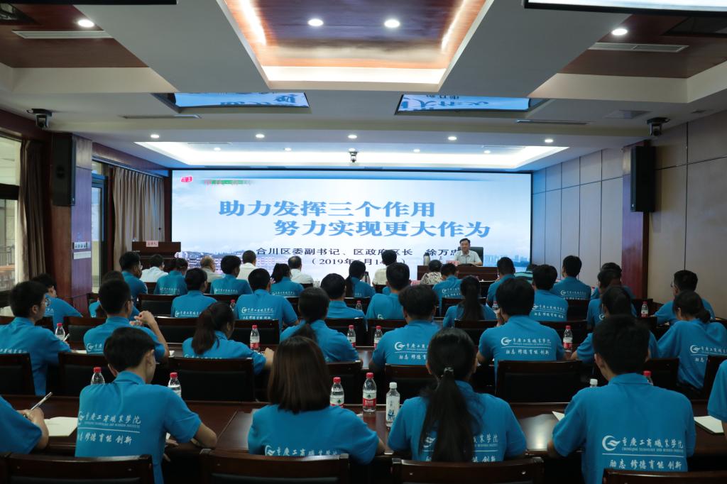 徐区长以《助力发挥“三个作用”,努力实现更大作为》为题做专题报告,为学校师生宣讲了习近平总书记视察重庆重要讲话精神,重点围绕习近平总书记对重庆提出的在推进新时代西部大开发中发挥支撑作用、在推进共建“一带一路”中发挥带动作用、在推进长江经济带绿色发展中发挥示范作用的要求,系统阐述了在重庆发挥“三个作用”中如何展现合川作为;向参加活动的师生介绍了学校经济社会发展情况以及合川区支持高等教育发展、吸引高校毕业生留在合川参与合川建设等政策。