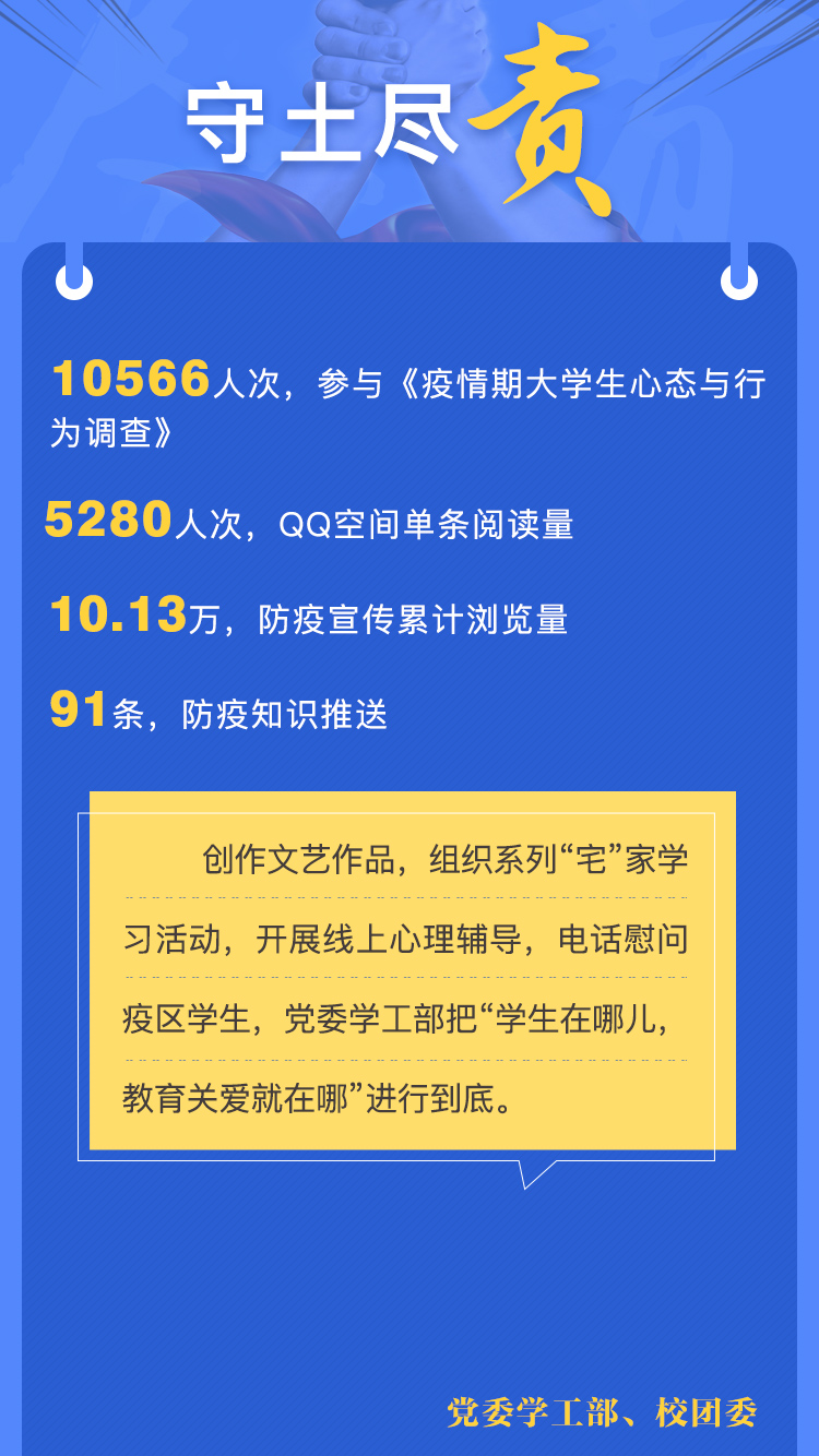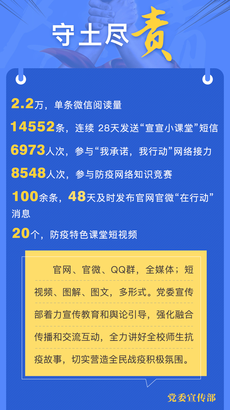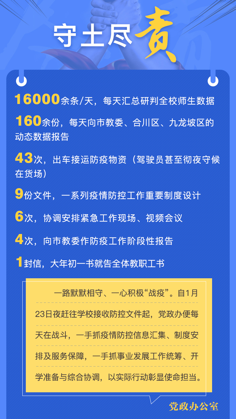 新冠肺炎疫情发生以来,机关一党总支切实把疫情防控作为最重要的政治任务,充分发挥基层党组织战斗堡垒作用和党员先锋模范作用,从自发成立学校第一个“党员突击队”到党员志愿者服务社区,党旗始终高高飘扬在防控疫情斗争第一线。总支所属各部门守土有责、守土负责、守土尽责,从综合协调、守护校园安全到宣传教育、学生工作、履职监督,各部门主动作为,扎实工作,为学校赢下疫情防控攻坚战贡献了机关一总支的力量。