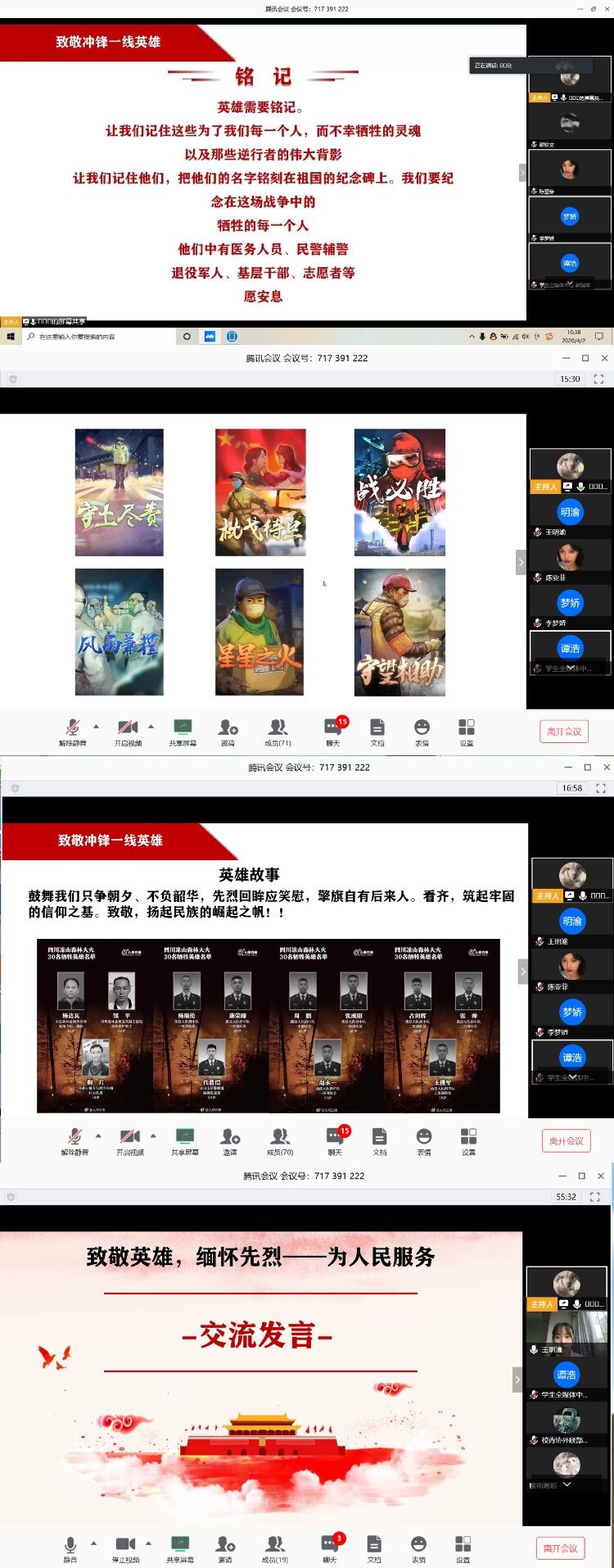 远程教育中心刘双老师表示,烟雨清明祭英烈,长风浩荡忠魂传。愿逝者安息,愿生者奋发,愿山河无恙,愿祖国昌盛!刘万荣老师表示,战“疫”仍在继续,我们要化悲痛为力量,坚守各自岗位,勇于担当作为,做到守土有责、守土担责、守土尽责,积合力以致胜、汇众智而成功。