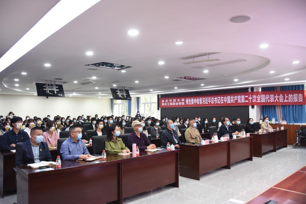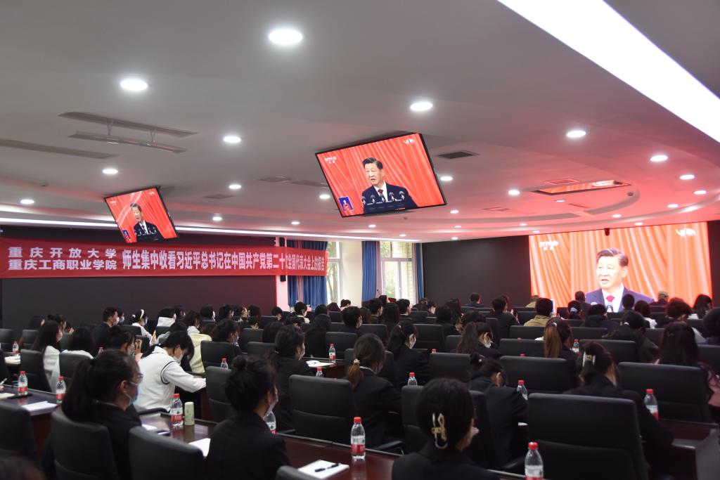 校领导、党员代表、思政课教师、学生骨干分别在华岩校区会议室、合川校区学生活动中心、学生社区党团活动室、教室等场地集中收看开幕会。党委书记郭庆等党员领导干部就近与师生一起集中收看开幕会活动。全校师生还纷纷通过广播、手机、电脑等形式收听收看二十大开幕会。全市开放大学办学体系也分别组织师生员工集中收看了开幕会盛况。