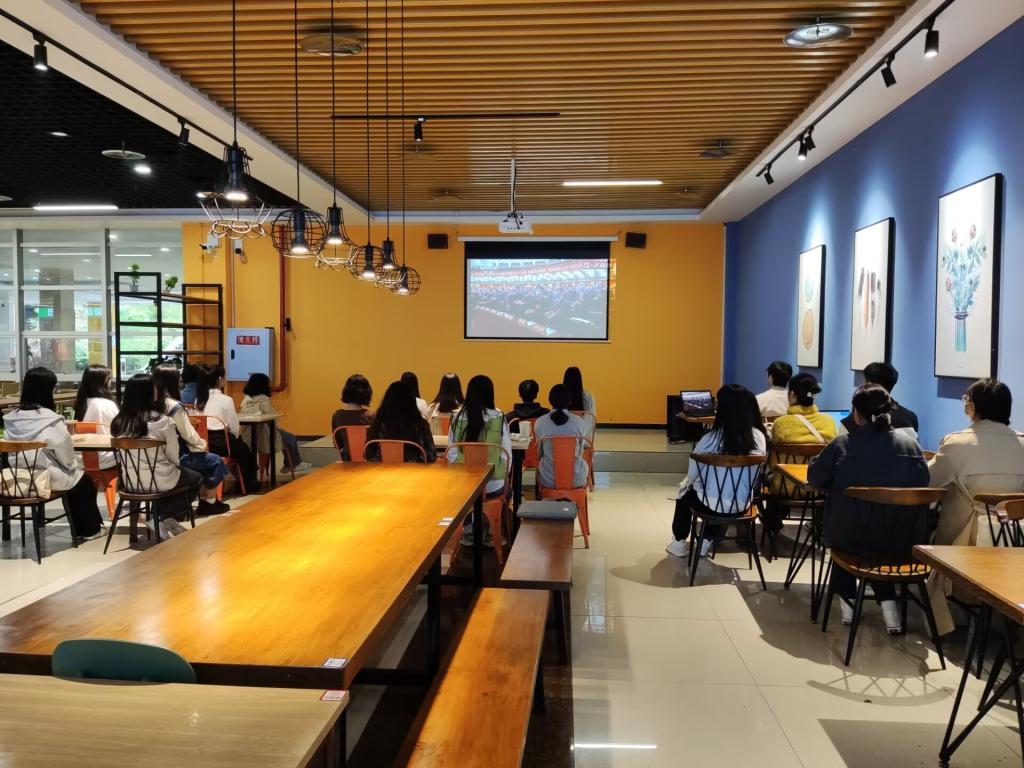 我校师生在两校区会议室、学生活动中心、党团活动室、食堂等多地集中收看党的二十大开幕会