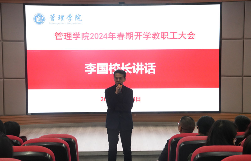 李国校长在管理学院教职工大会上讲话。李国校长强调,2023年是不平凡的一年,2024年更是关键的一年。他期望学院全体教职工紧跟学校步伐,扎实推进服务“双高计划”建设、做好开放大学建设、构建产教融合新生态等22项年度重点工作。全体教职工更要坚持政治引领、提高站位,把责任担起来;坚持目标导向、强化合作,把事业干起来;坚持成果导向、赛马比拼,把成绩晒起来,以优异成绩迎接新中国成立75周年。