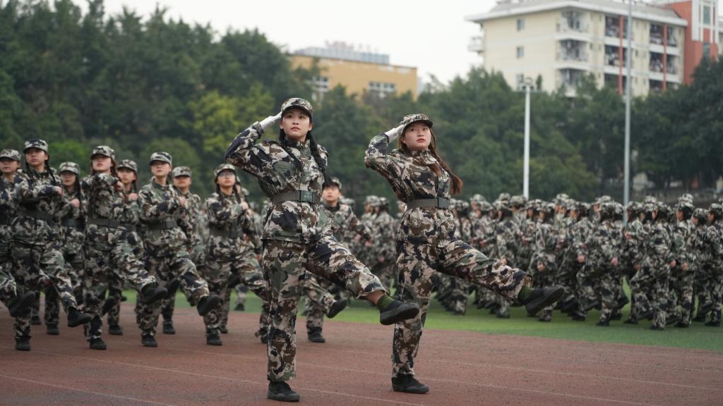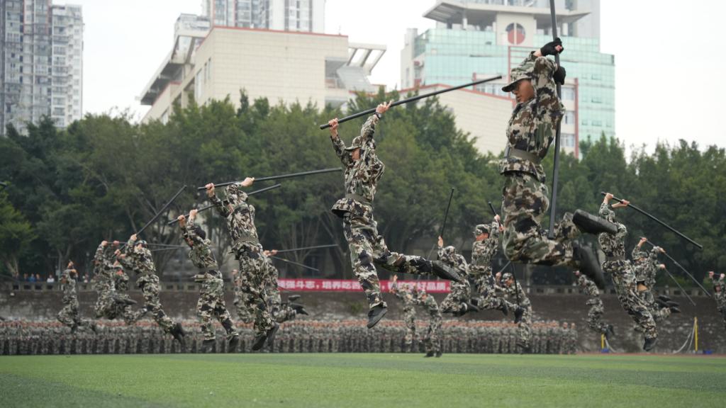 在雄壮的国歌声中,军训成果汇报大会拉开帷幕。在团旗指引下,分列式各方阵踏着整齐的步伐、喊着嘹亮的口号,依次走过主席台。随后,擒敌拳、匍匐刀、棍术、刺杀操、战术、军体拳等方阵陆续进行了精彩表演。