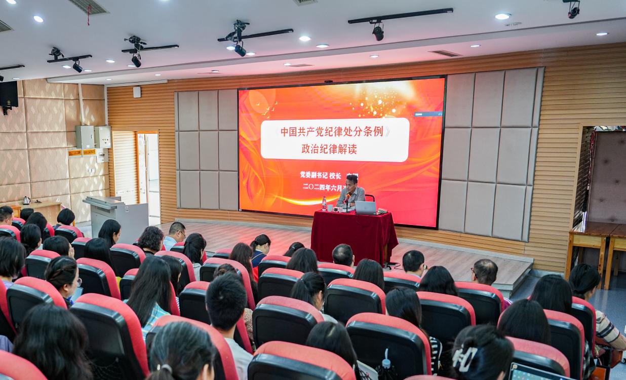 李国校长围绕学习贯彻《条例》,从深刻认识全面从严治党的新形势新要求、当前教育系统全面从严治党面临的形势和任务,准确把握《条例》修订的背景和要点,结合身边的案例对违反政治纪律行为的处分进行了解读。李国校长要求,《中国共产党纪律处分条例》作为将全面从严治党向纵深推进的制度保证,全体党员要持续深入学习《条例》,自觉将纪律要求内化于心、外化于行,坚定理想信念、加强党性修养,提升政治素养。