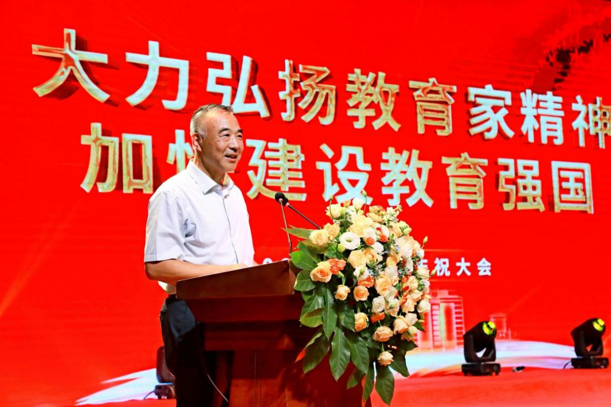 党委书记郭庆代表学校党委向辛勤耕耘、躬身育人的全校教职工,关心支持学校建设发展的离退休老同志,办学体系的广大教职工致以诚挚的节日问候,向所有受表彰的集体和个人表示热烈祝贺。郭庆书记指出,今年是新中国成立75周年,学校也喜迎建校45周年,四十五年来,学校在发展建设、办学体系建设、人才队伍建设等方面都取得了瞩目的成就,这些都是全校教职工爱岗敬业、无私奉献的结果。