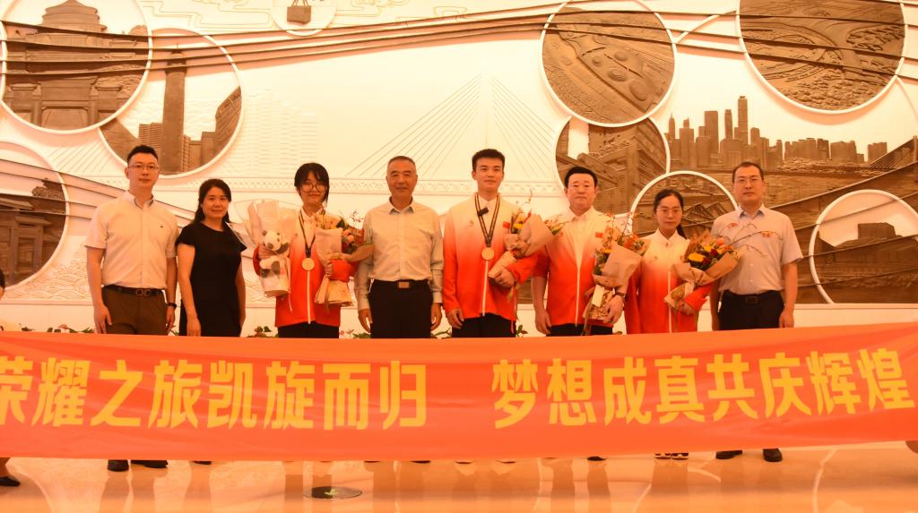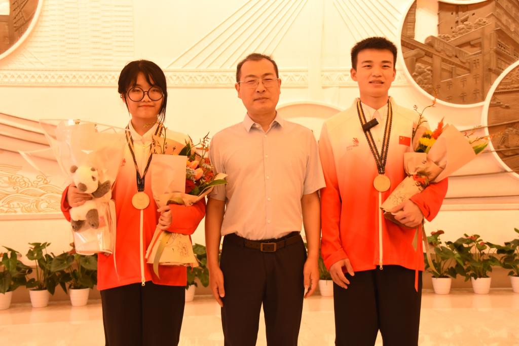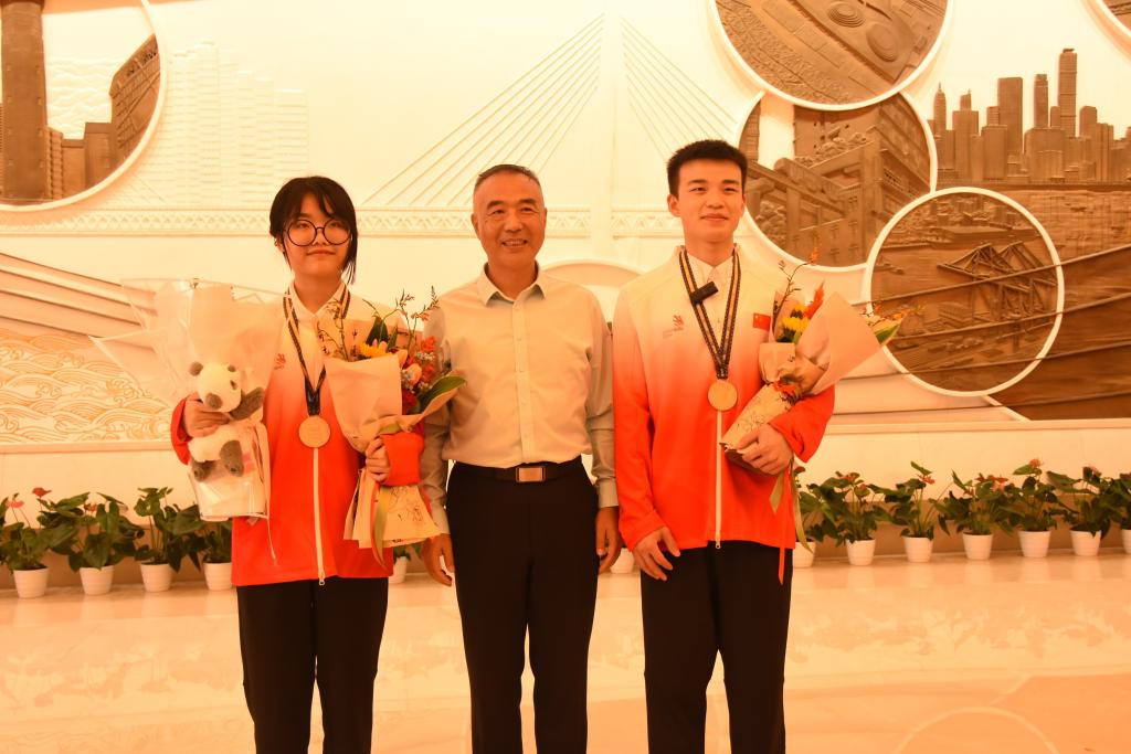 郭庆与巫妍婷、熊首钰亲切交谈,代表学校庆贺他们凯旋回家,“看到你们在赛场上获得金牌为国争光,我们都为你们骄傲,学校因你们而自豪!希望你们今后继续加油,为祖国争取更多的荣誉!”。
